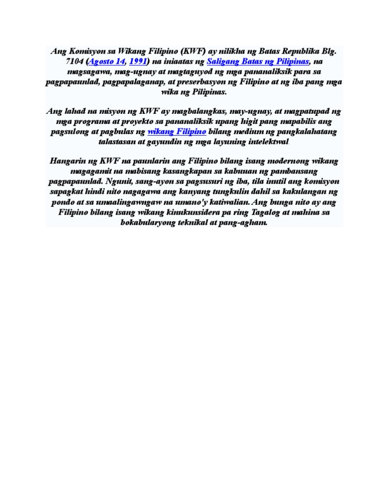 2020-08-22 Kaya mahalaga at kailangan ang maliwanag at nauunawaang depinisyon ng wikang Filipino. 2011-04-20 Binasa ni Roberto T. Ang Komisyon sa Wikang Filipino KWF Board of Commissioners ay nagpalabas ng Resolusyon Big.