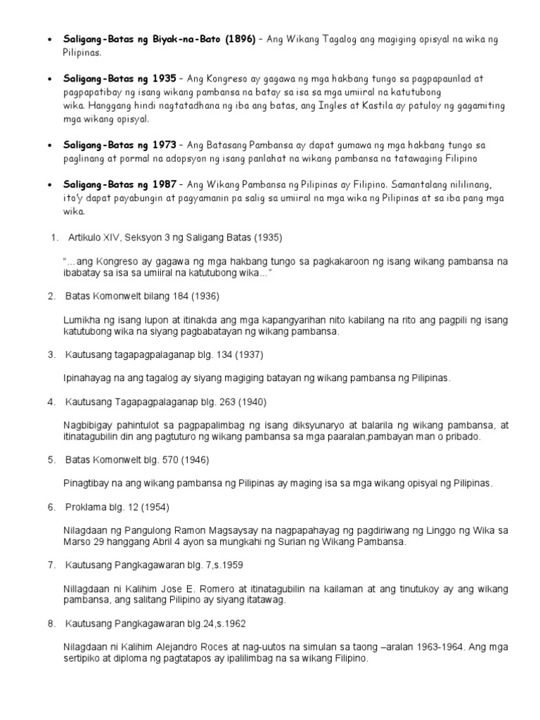 Naglalahad ng mga batas sa paglinang pagpapalaganap ng Filipino bilang wikang pambansa. Learn faster with spaced repetition. 2001 Tungo sa mabilis na estandardisasyon at intelektwalisasyon ng Wikang Filipino ipinalabas ng Komisyon ng Wikang Filipino ang 2001 Revisyon ng Ortograpiyang Filipino at Patnubay sa Ispeling ng Wikang.