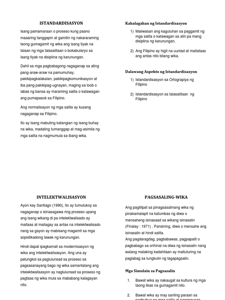 Istandardisasyon Intelektwalisasyon Pagsasalin Wika