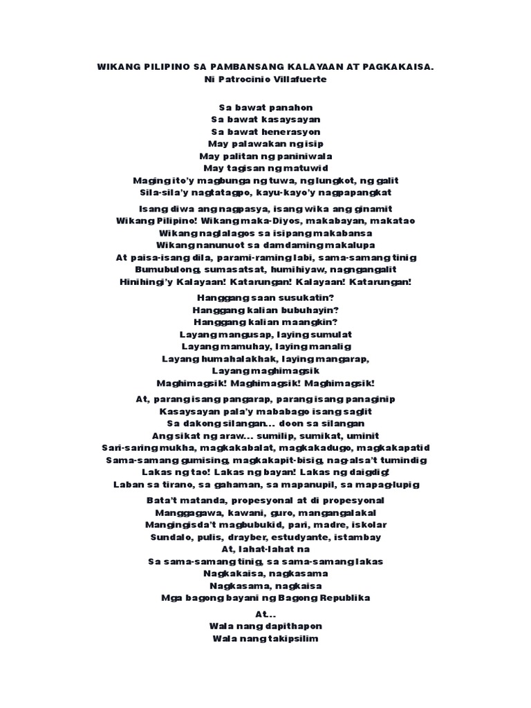 Wikang Pilipino sa Pambansang Kalayaan at Pagkakaisa ni Patrocinio Villafuerte Sa bawat panahon Sa bawat kasaysayan Sa bawat henerasyon May palawakan ng isip May palitan ng paniniwala May tagisan ng matwid Maging itoy magbunga ng tuwa ng lungkot ng galit Sila-silay nagtatagpo kayu-kayoy nagpapangkat Isang diwa ang nagpasya isang wika ang ginamit Wikang. Follow 0 Comments 1 Like Statistics. Mula sa pagkakasilang patungo sa kamusmusan maging sa paglaki hanggang sa kamatayan.