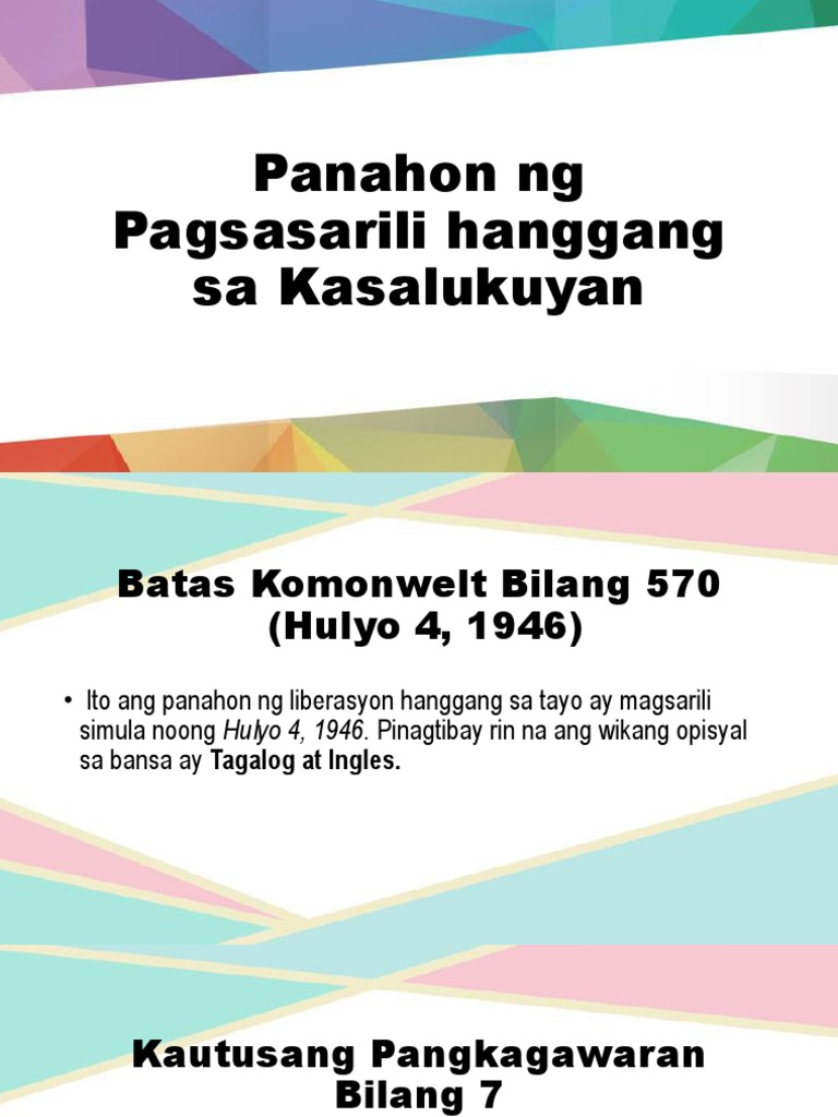 PANAHON NG REPUBLIKA Hulyo 4 1946- Ipinalaba sa Batas Komonwelt Blg. 2016-09-01 Panahon ng Kastila. Ang wikang ginamit sa pagtuturo ng kasaysayan pilosopiya at mga aralin sa panahon ng mga Amerikano.