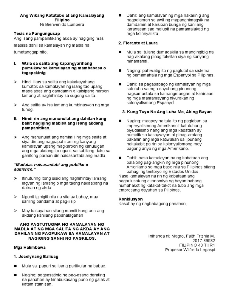 Ayon kay Bienvenido Lumbera ang wika ay palatandaan ng identidad ng isang bayan ang nag-uugnay sa estudyante sa kaniyang pamilya komunidad na kaniyang pinanggalingan sa kahapon ng bayan. Sa aking klase sa Ingles may mga sanaysay na binigay sa amin na gagamitin bilang gabay sa pagsulat. Ed Ang Wikang Filipino sa Loob at Labas ng Akademyat Bansa Unang Sourcebook ng Sangfil 1994-2001.