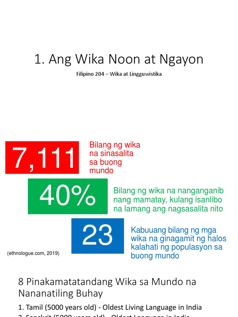 Ang wikang pambansa ng Pilipinas ay Filipino. Wika Noon Ano na Ngayon Ipinaliliwanag ng paksang ito ang pagpapalit-palit ng wikang ginagamit natin ngayon na inihantulad sa wikang ginagamit noon. Sa buong mundo may 6909 na wika ang ginagamit.