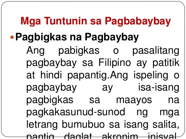 Found worksheet you are looking for. 2872013 Pasulat na Pagbaybay Mananatili ang isa-sa-isang tumbasan ng tunog at letra sa pagsulat na pagbaybay ng mga salita sa wikang Filipino. Pagbabaybay Sa Wikang Tagalog.