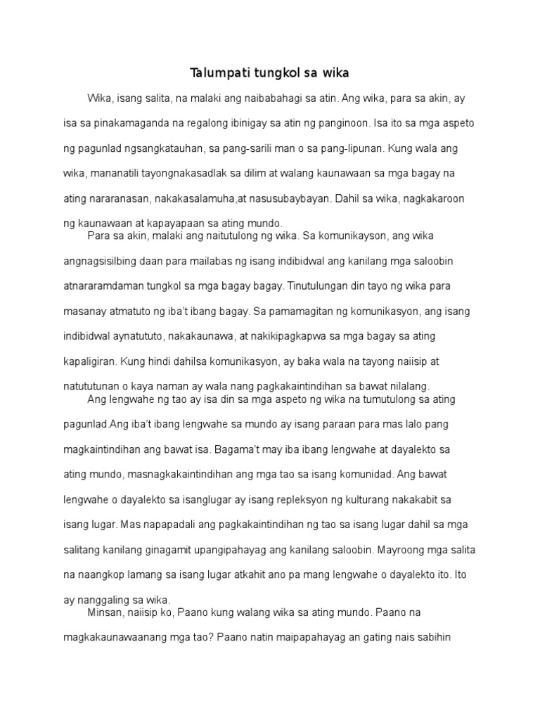 Huwag sana umaabot sa puntong iyon ang ating wika. Halimbawa ng talumpati Wikang Mapagbago tingnan ang. Ibig sabihin nito ay nagkakaisa na tayo noon pa man sa usapin tungkol sa wika.