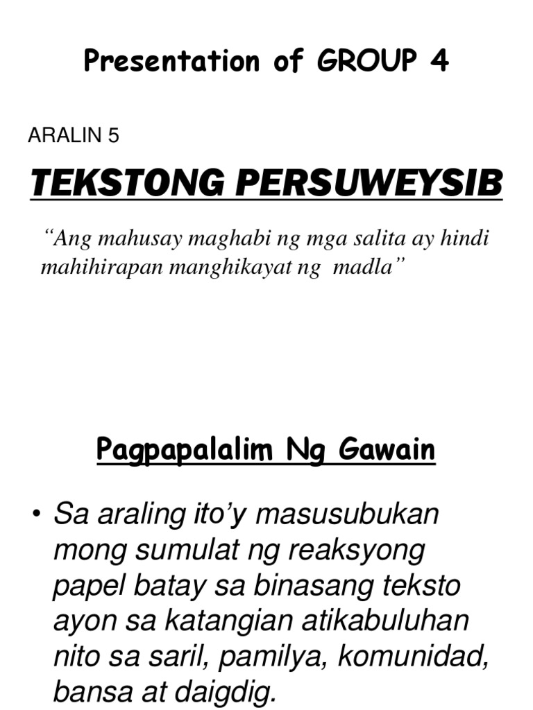 Start studying Aralin 4. Isinulat ito sa Ingles at isinalin sa Filipino nang ganito. Tukuyin ang nais ipabatid ng mga pahaya g sa ibaba.