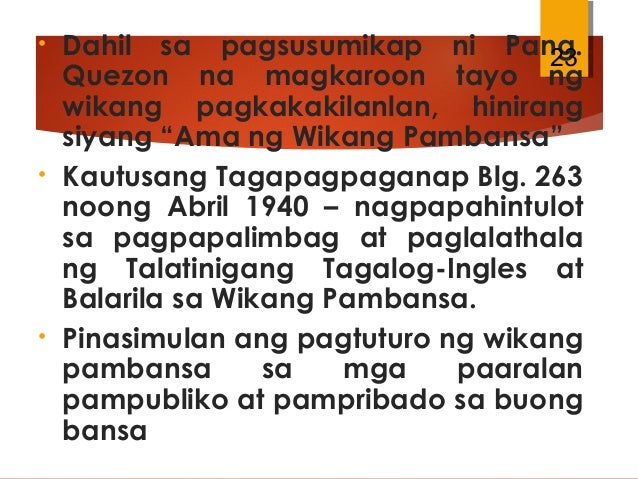 682016 Bunga ng ginawang pag-aaral at pag-alinsunod sa tadhana ng Batas ng Komonwelt Blg. 184 kayat itinagubilin nito noon Nobiyember 9 1937 sa Pangulo ng Pilipinas na iyon ay pagtibayin bilang saligan ng Wikang. Mahalagang maintindihan ang kasaysayan ng Wikang Pambansa kung paano ito nagsimula bilang Tagalog kung saan umalma ang mga Bisaya naging Pilipino at ngayon nga ay Filipino na.