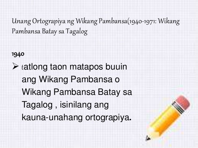 Written by Resty Cena. Filipino 1973 Constitution -Nagsasaad na ang pagdevelop at pagkakaroon ng pambansang wikang tatawaging Filipino. 1mailahad ang uri ng balabaybayan at tuntunin nito2maibigay ang maikling kaalaman hinggil sa filipino bilang wikang pambansa3matutukoy ang mga makabagong alpabetong filipino 4maisa isa ang mga gabay tungo sa ortograpiyang filipino5mabigyang kahulugan ang pantig at pagpapantig.