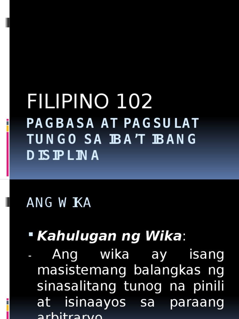 Ang FILDIS ay isang praktikal na kursong nagpapalawak at nagpapalalim sa kasanayan sa malalim at mapanuring pagbasa pagsulat at pananaliksik sa wikang Filipino sa ibat ibang larangan sa konteksto ng kontemporaryong sitwasyon at mga pangangailangan ng bansa at ng mga. Filipino Bilang Wi kang P ambansa Wika ng Ba yan at Wika ng. Malinang ang adhikaing makibahagi sa pagbabagong panlipunan.