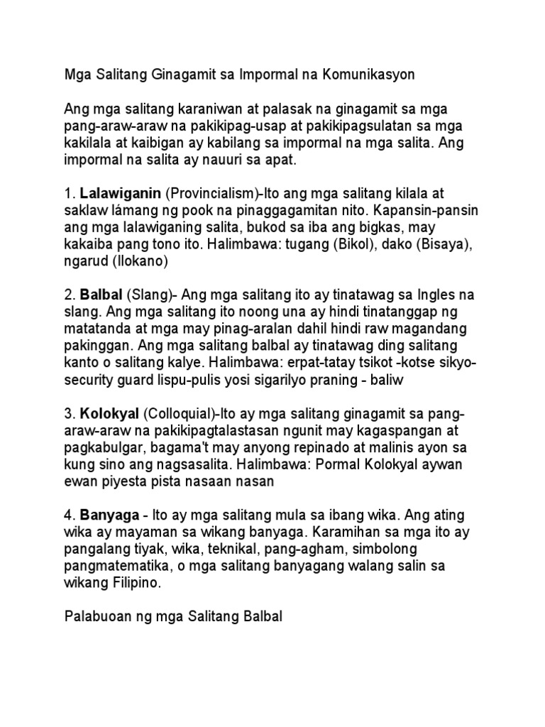 Hango sa wikang banyaga o katutubo Pinaghalo-halo Binaligtad Salitang balbal Iningles Nilkiha 15M Dinaglat Pangungusap. The Filipino words Paano lumaganap ang katutubo sa pilipinas hanggang ngayo. 1Ang BALBAL o islang ay ang di-pamantayang paggamit ng mga salita sa isang wika ng isang partikular na grupo ng lipunan.